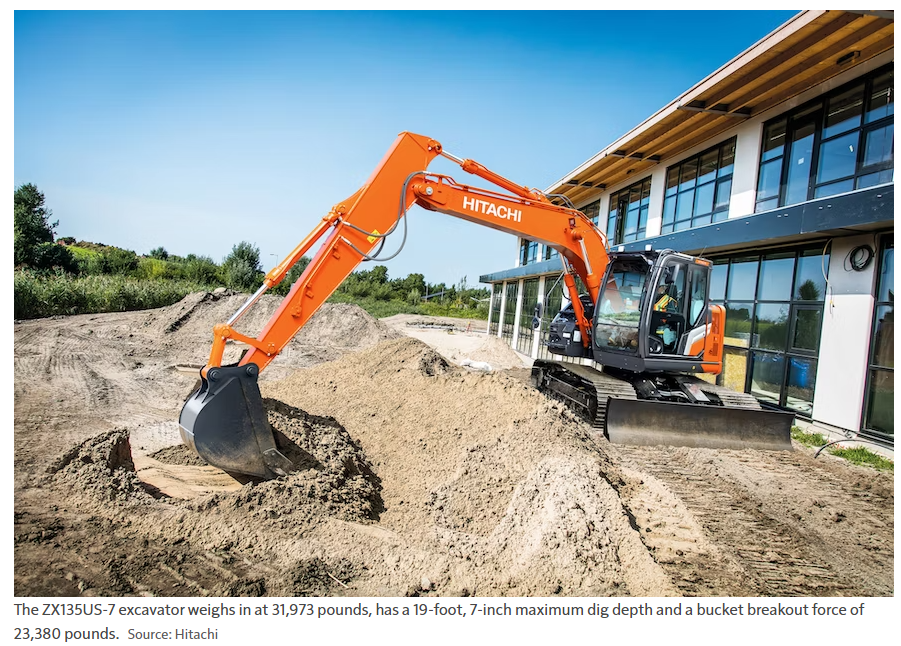 The ZX135US-7 excavator weighs in at 31,973 pounds, has a 19-foot 7-inch maximum dig depth and a bucket breakout force of 23,380 pounds.