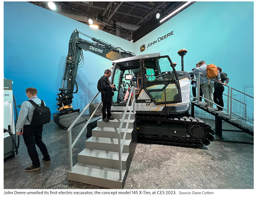 John Deere unveiled its new 145 X-Tier electric excavator model at CES 2023 in Las Vegas.