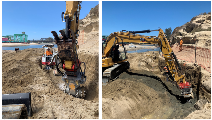 Syblon Reid was challenged with a project on the side of a riverbank. The MB-R700 drum cutter was installed on a Caterpillar 315 excavator to widen and deepen an existing sandstone trench that had an abandoned clay pipe capped with concrete.